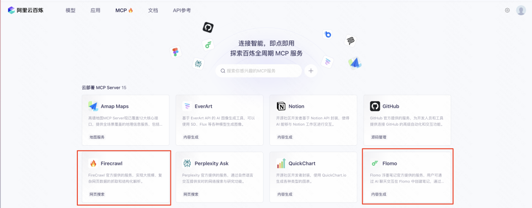 返回 阿里云百炼 的 MCP 市场,搜索并找到 Firecrawl 和 Flomo 的 MCP 服务。在开通服务时,系统会提示输入之前获取的 API Key 或 API 地址。