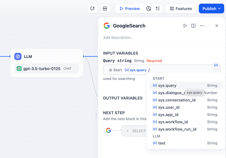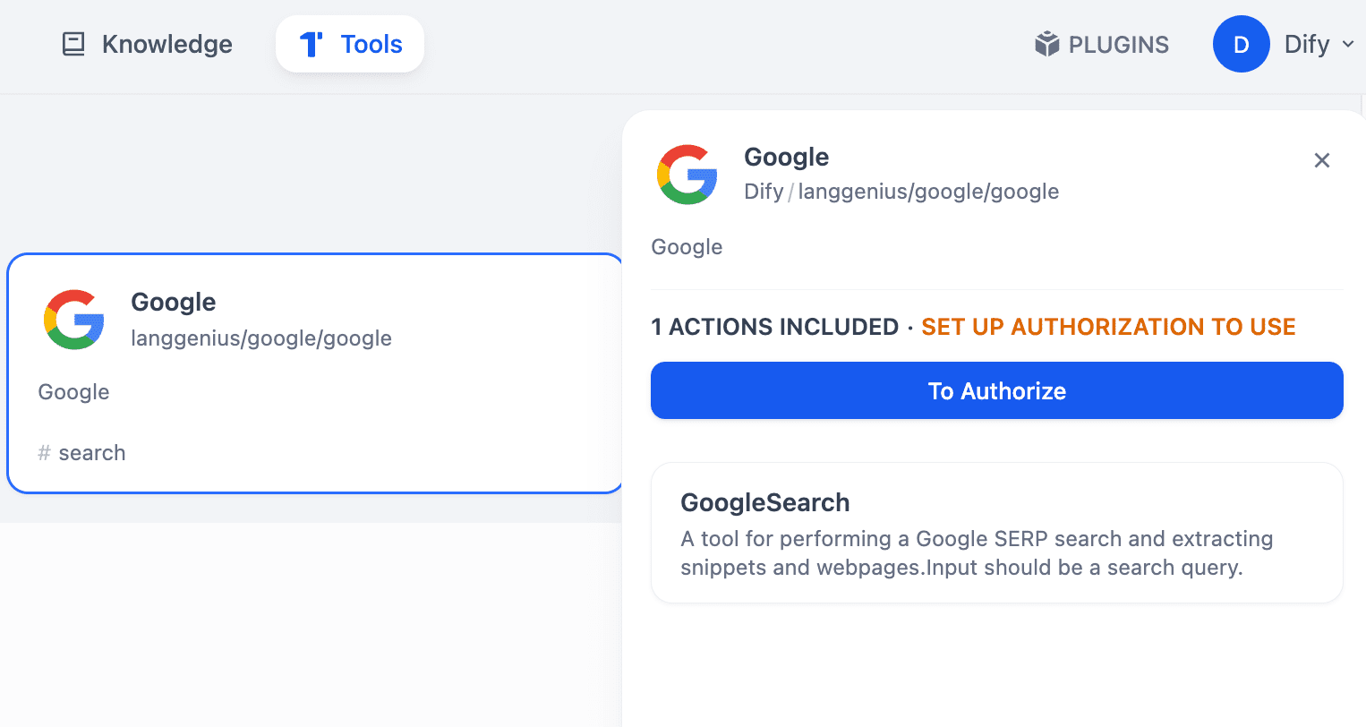 工具插件支持在 Chatflow、Workflow、Agent 应用内使用。本章节将以 Google 工具插件为例,演示如何在以上应用类型内使用。