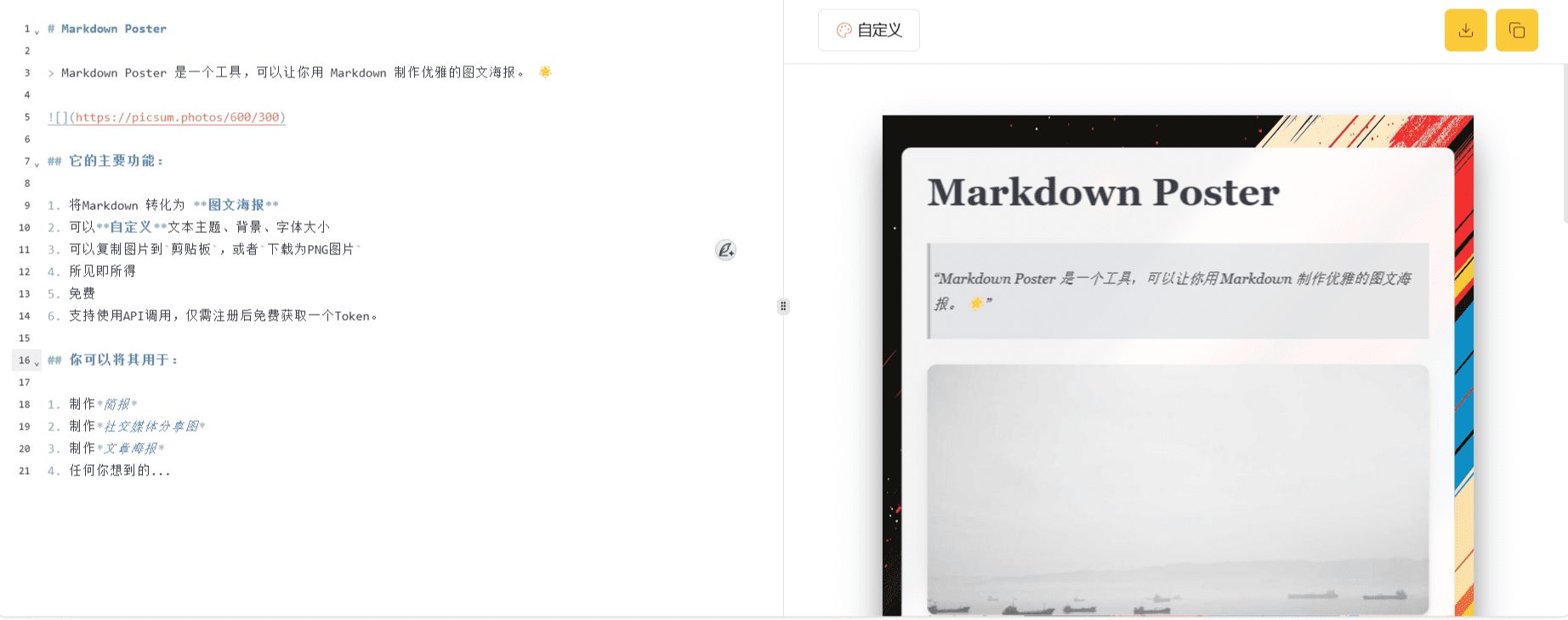 - Markdown To Poster Image Tool:Flexible editing with Markdown, real-time preview, and support for exporting to images. Supports multiple poster templates and themes. And provides a free poster rendering API that can be integrated into your website, Bot, ChatGPT, Coze and other platforms. Free Tools!