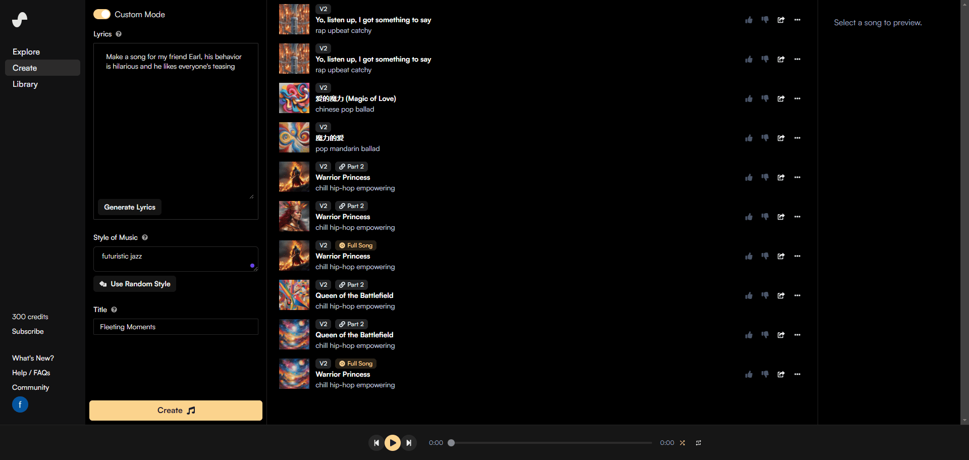 8. Suno will merge all the music fragments together to form a complete song. Please note that the "Get Whole Song" button does not consume points, but each continuation will consume 10 points like the first song.