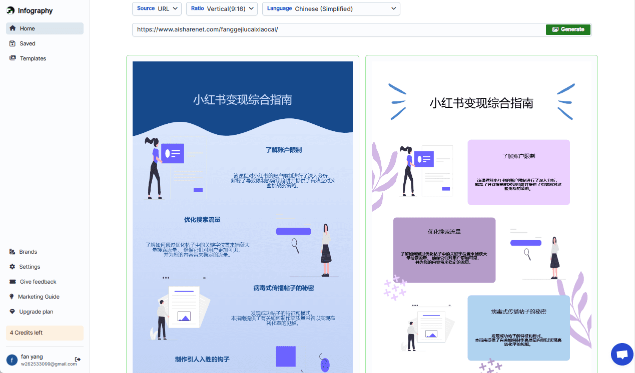 - 信息图表将自动发布到所选平台,并附带链接,吸引更多流量回到博客或网站。