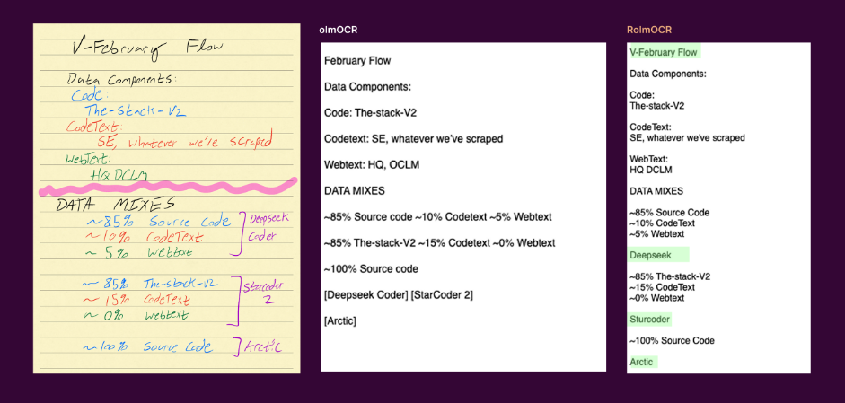 RolmOCRは手書き文字を認識します。例えば、「Deepseek Coder」と書かれたメモが「OCLM」と間違われることなく正確に出力される。画像をアップロードすると、自然な順序でソートされます。 - 歪んだ文書処理