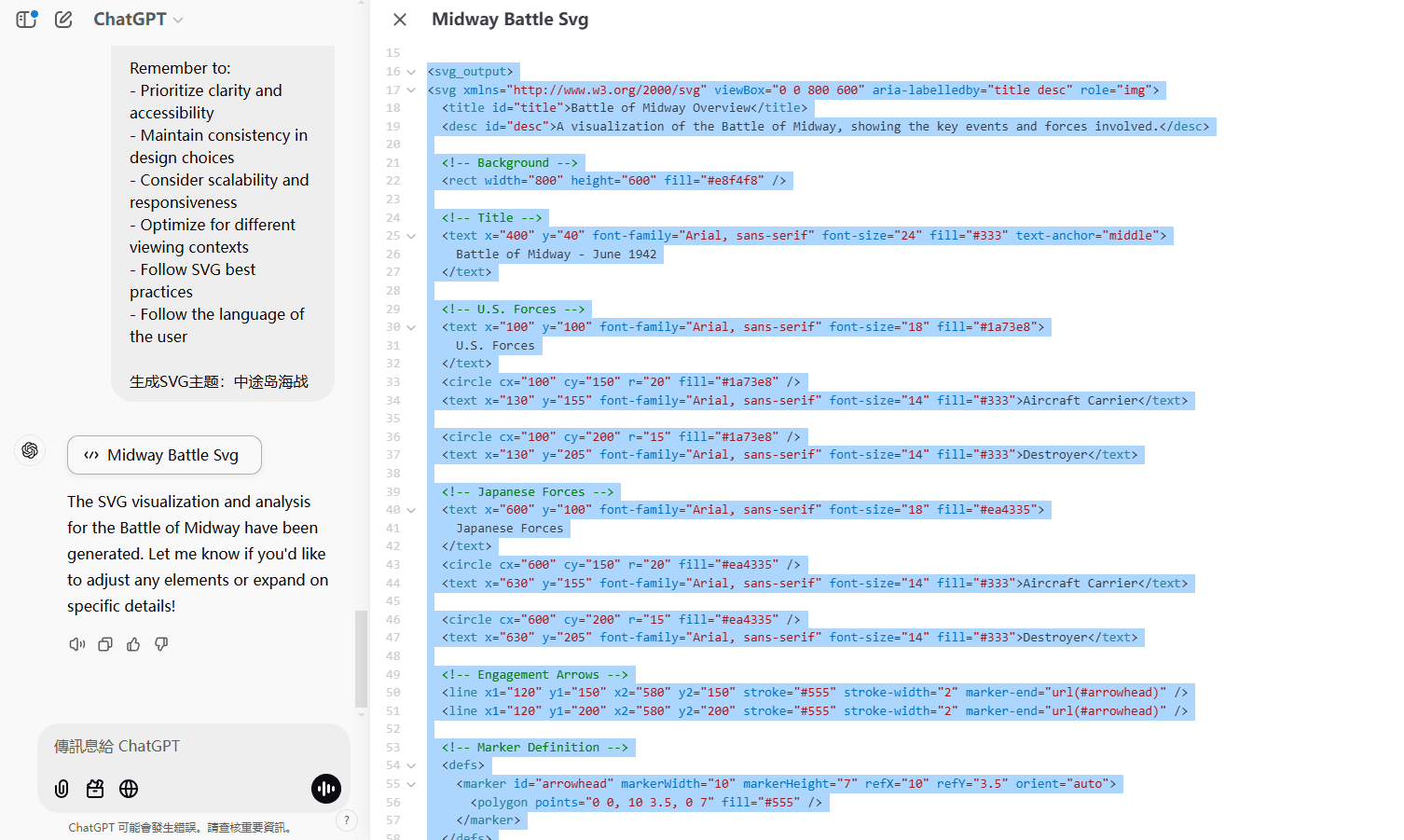 当然你也可以使用ChatGPT生成,但无法直接在画布中预览SVG: