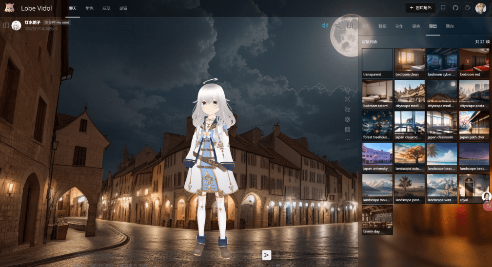 通过消息框中的视频按钮,你可以与角色模型进行更丰富的交互体验,如面对面聊天,角色表演等,也可以设置角色所处的背景,舞台,动作,舞蹈等。