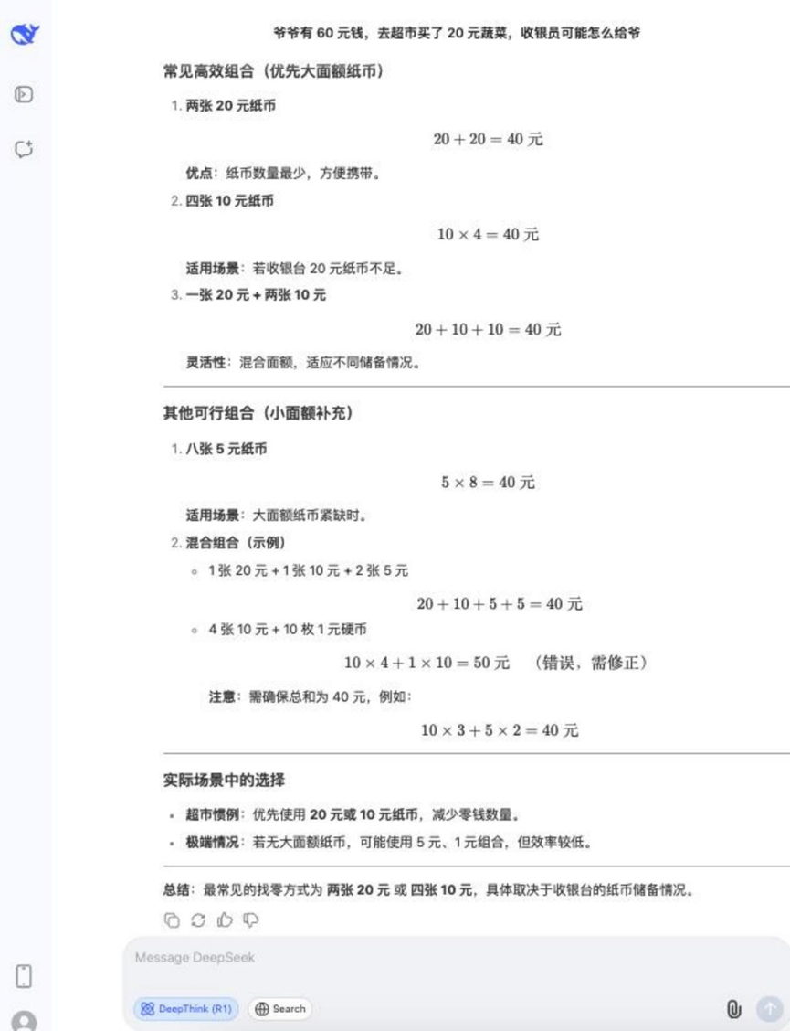 - 对输入错误的鲁棒性: 测试中观察到,即使问题描述中存在轻微的符号错误或表述不规范,部分模型仍能正确理解题意并进行解答,显示出一定的鲁棒性。但这并不意味着模型总能忽略错误,关键信息的错误仍会导致解答失败。